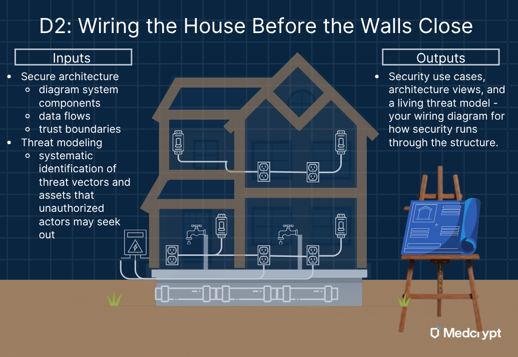 Here, product managers, engineers, and security SMEs collaborate to turn stakeholder and regulatory expectations into detailed blueprints. Each security control - authentication, encryption, audit logging, update management, system hardening - gets a “place” in the structure, is tagged and reviewed to make sure it’s appropriate for the environment and can be verified later.
