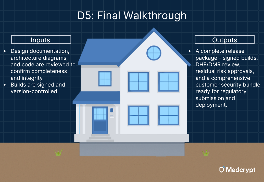 All design documentation, architecture diagrams, and code are reviewed to confirm completeness and integrity. Builds are signed and version-controlled, ensuring the production team always works from the approved design. Keys and credentials are handled with care, like passing the home’s master keys from builder to owner.