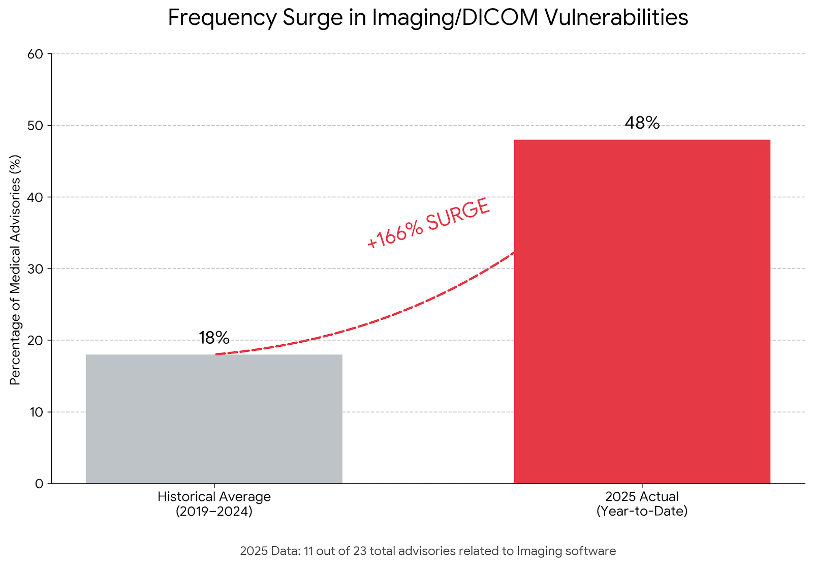 2025 Statistics: 48% of all 2025 medical advisories (11 out of 23) were specifically related to DICOM viewers, PACS (Picture Archiving and Communication Systems), or imaging software.