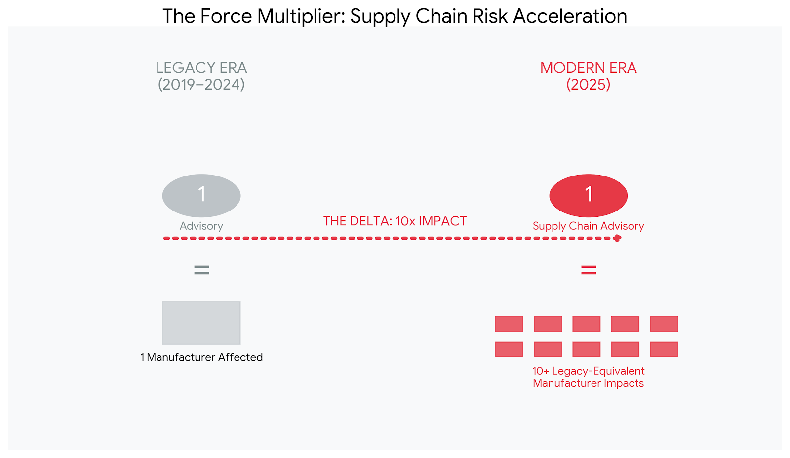 The Delta: A nearly 2x increase in the focus on third-party components. One "Supply Chain" advisory now carries the weight of roughly 10 legacy advisories in terms of total devices affected.